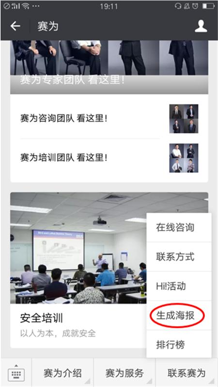 1、1、进入“赛为”,点击下方自定义菜单“联系赛为→生成海报”;或在“赛为”微信订阅号回复“HSW”,自动生成海报。